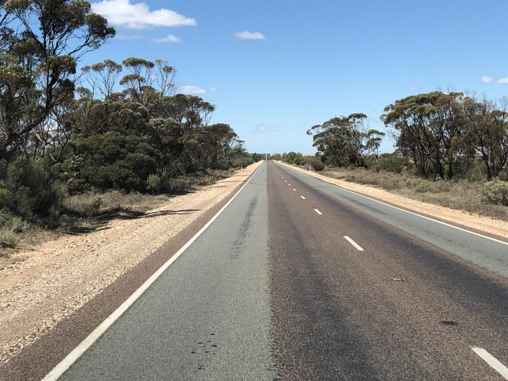 Der längste Ritt auf der Strecke von Perth in Richtung Adelaide kommt gleich hinter der paradiesischen Lucky Bay und ist bei Reisenden durchaus berüchtigt. Denn die Strecke zieht sich gut 1500 Kilometer durch eine Landschaft, die so abwechslungsreich ist wie Ostwestfalen bei Nacht. Wir sind die Strecke von Esperance bis Ceduna in einem Rutsch gefahren. Vor Ceduna passiert man die Grenze zum Bundesstaat South Australia und erreicht damit auch eine neue Zeitzone, in der es auf einen Schlag zweieinhalb Stunden später ist.