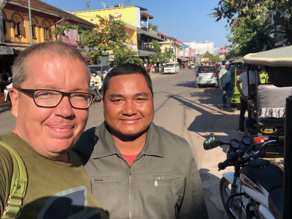 Mr. Sam nannte sich mein Tuk-Tuk-Fahrer wobei Sam wie Samweis Gamdschie aus Herr der Ringe ausgesprochen wird. Und an den hat er mich auch ein bisschen erinnert: beherzt im völlig chaotischen kambodschanischen Verkehr, sehr freundlich und aufmerksam. Nach unserem ersten Tag, an dem ich acht oder zehn Tempel bei 35 Grad besucht habe, hatte ich ihm gesagt, dass ich jetzt ins Hotel und an der Bar ein paar Bier trinken will. Am nächsten Tag hat er in seiner Box, in der immer kaltes Wasser und eisgekühlte Waschlappen für seine Fahrgäste bereit liegen, drei Dosen Bier für mich gehabt. Die wollte er mir allerdings schon bei unserem ersten Stop um kurz nach 8 Uhr andrehen, da musste ich doch passen. Wie alle Tuk-Tuk-Fahrer hier ist er im Grunde seines Herzens sehr gemütlich. Er hat zwar hier schon unzählige Touristen durchkutschiert, hat aber selbst noch keinen einzigen der Tempel selbst besucht. Er sei dafür zu müde, meint er.