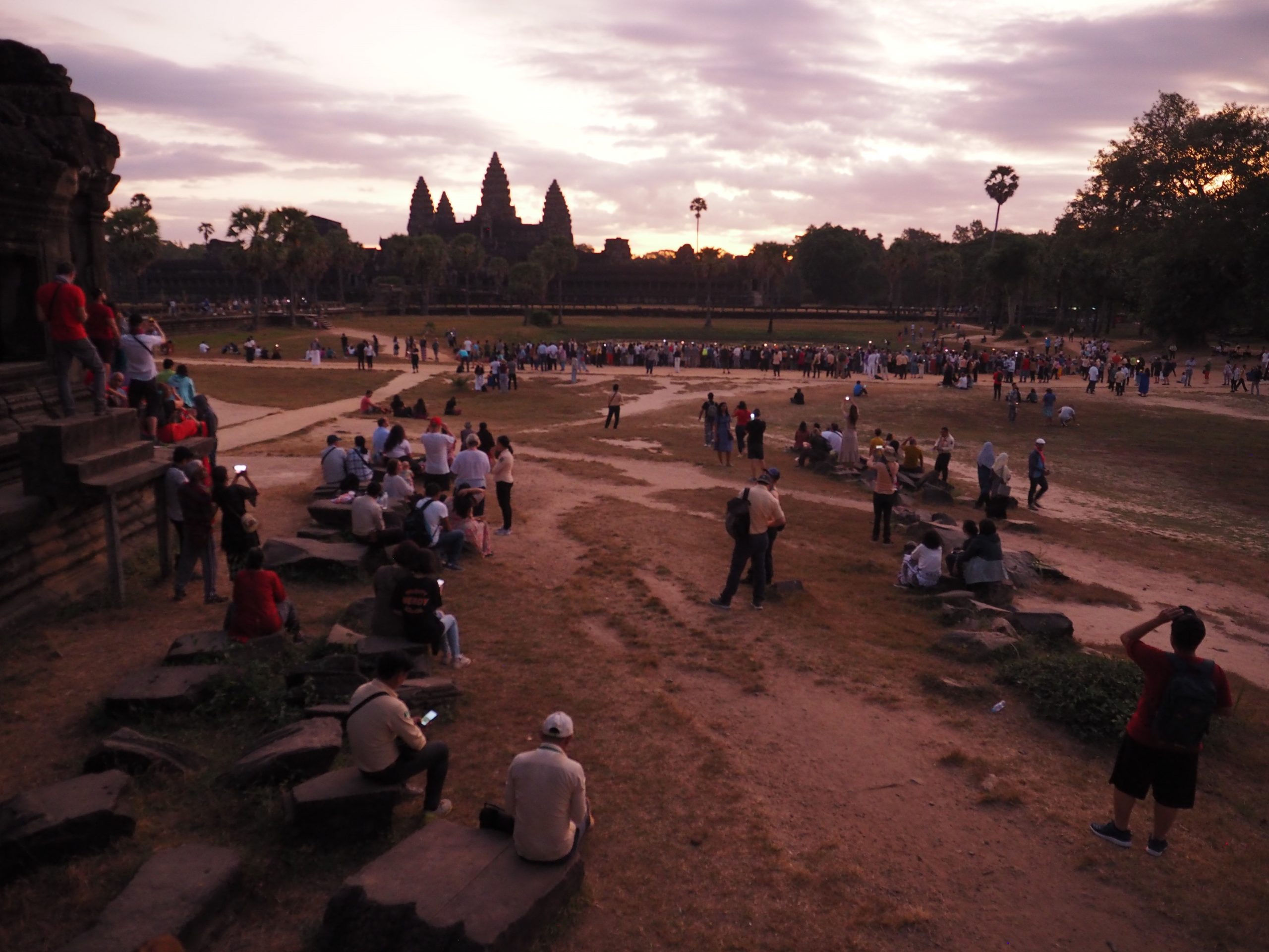 Im Vergleich zu einigen anderen Tempeln fand ich Angkor Wat ziemlich langweilig. Allerdings bietet er zum Sonnenaufgang eine schöne Kulisse, wie ich an meinem dritten Besuchstag erleben durfte. Mit mir waren an dem Morgen allerdings auch locker 2000 andere Touristen da. Die meisten stehen dann an einem Seerosenteich, weil sie auf ein Bild hoffen, bei dem sich Tempel und aufgehende Sonne zusätzlich im Wasser spiegeln. Sieht bestimmt toll aus, man muss aber mindestens eine Stunde vor Sonnenaufgang da sein, um eine Chance auf einen Platz zu haben. Der Platz, den ich mir stattdessen ausgesucht habe, hat mir auch gereicht.