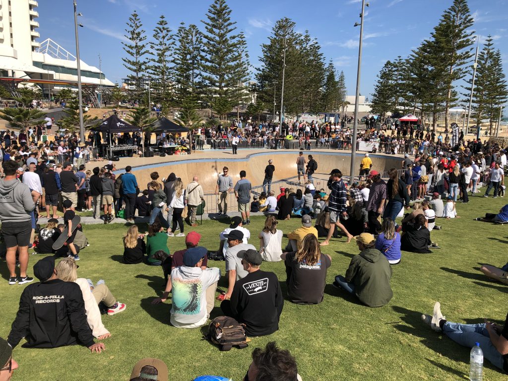 Wie ich an dieser Stelle schon geschrieben habe, ist ein Tag für die Australier perfekt, wenn er am Strand stattfindet und idealerweise mindestens ein Brett dabei ist: auf Rollen oder auf Wellen. Am vergangenen Sonntag ist das am Scarborourgh Beach noch einmal besonders zelebriert worden. Da gab es nämlich – praktisch zu meinem Abschied – ein Skate-und-Surf-Festival. Eine richtig lässige Veranstaltung. In der Skate-Bowl am Strand sind Skater verschiedener Altersklassen gegeneinander angetreten. Die Kleinsten waren vielleicht acht oder neun Jahre alt, die Ältesten um die 50. Und bei allen konnte man nur staunend zusehen.