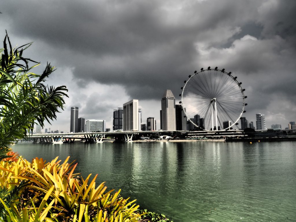 Blick auf die Innenstadt samt Riesenrad von der Nordseite des Gardens by the Bay aus. Fotografiert mit einem künstlichen Filter.