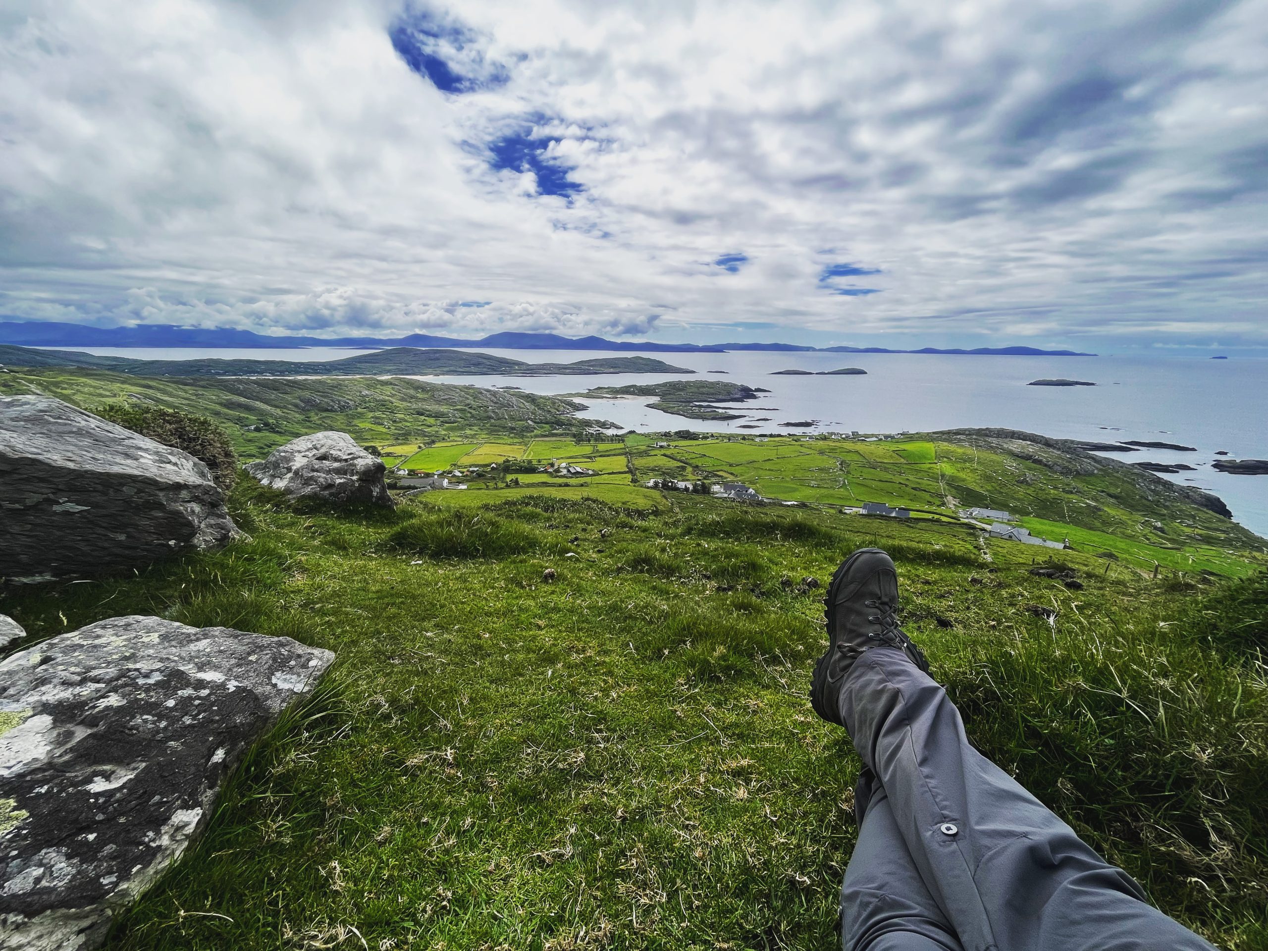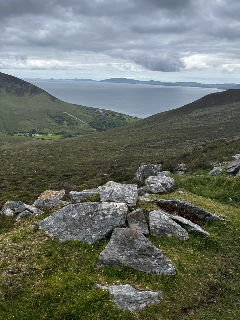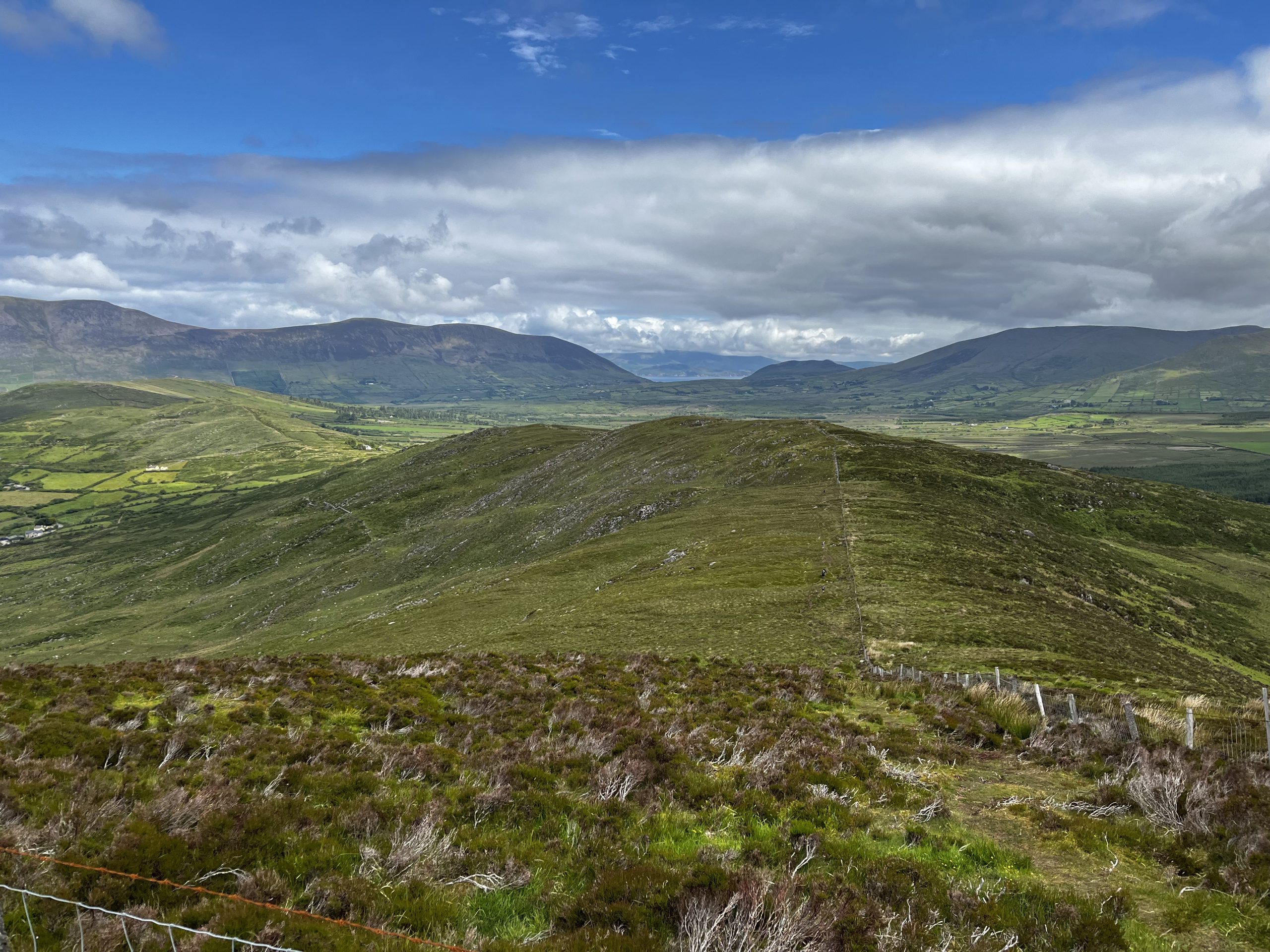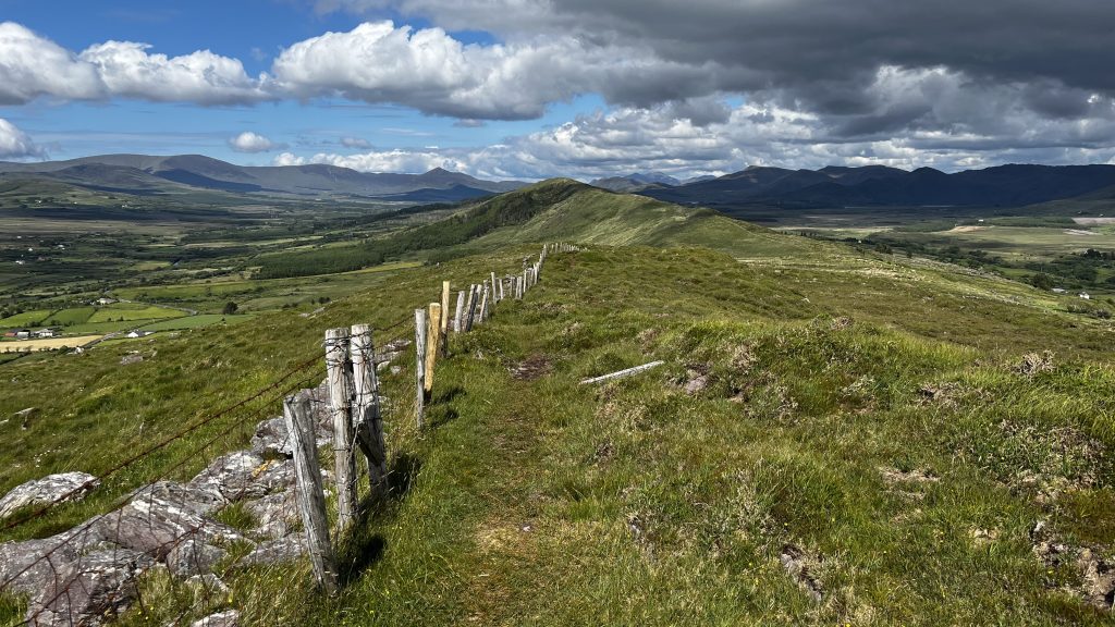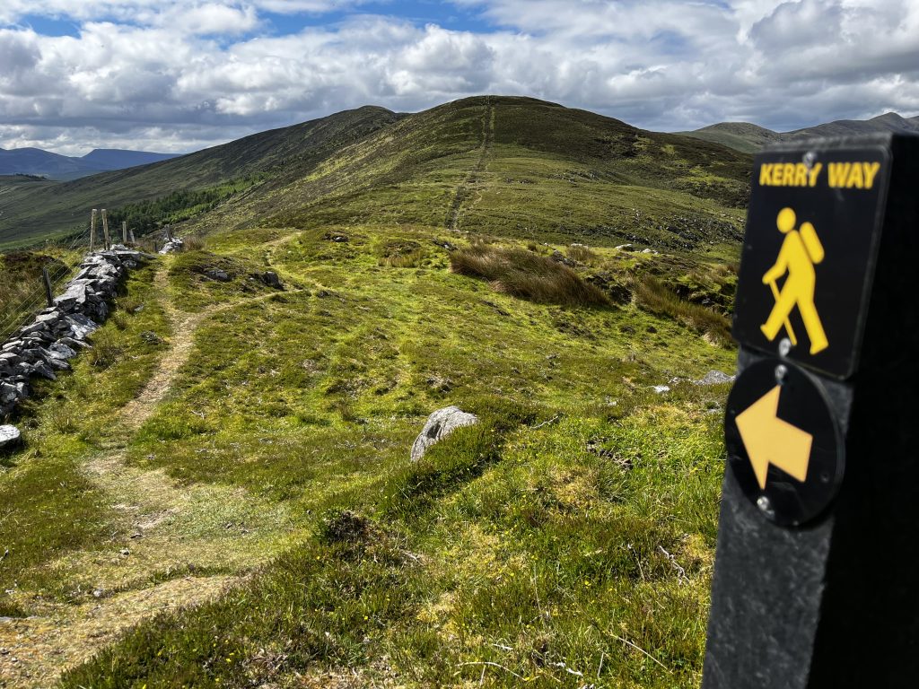 Der zweite Tag auf dem Kerry Way belohnt jene, die vorher ein bisschen trainiert haben. Und die Etappe ist echt gnadenlos zu denen, die sich auf einen leichten Spaziergang eingestellt haben. Wir haben sie unterwegs die Etappe der 1000 Hügel genannt. Die Strecke führt über einen langen Bergrücken mit stetigem Auf und Ab. Bei jedem Hügel denkt man, dass dies nun aber wirklich der höchste Punkt der Etappe sein muss, bevor sich das Land wieder für das Auge öffnet und man den nächsten Hügel vor sich sieht, vor dem man natürlich erst mal wieder ein Stück hinunter muss.
