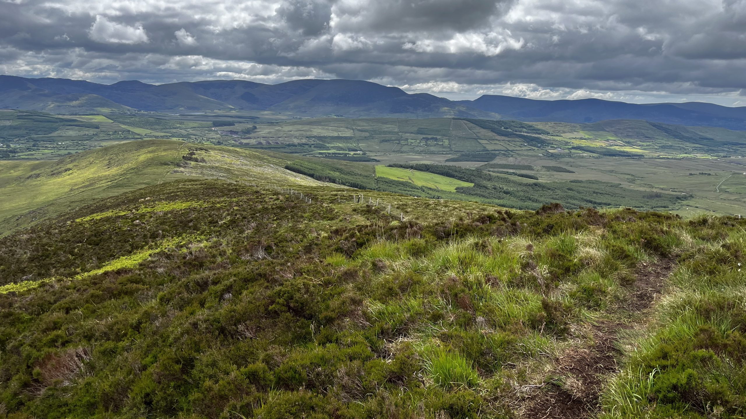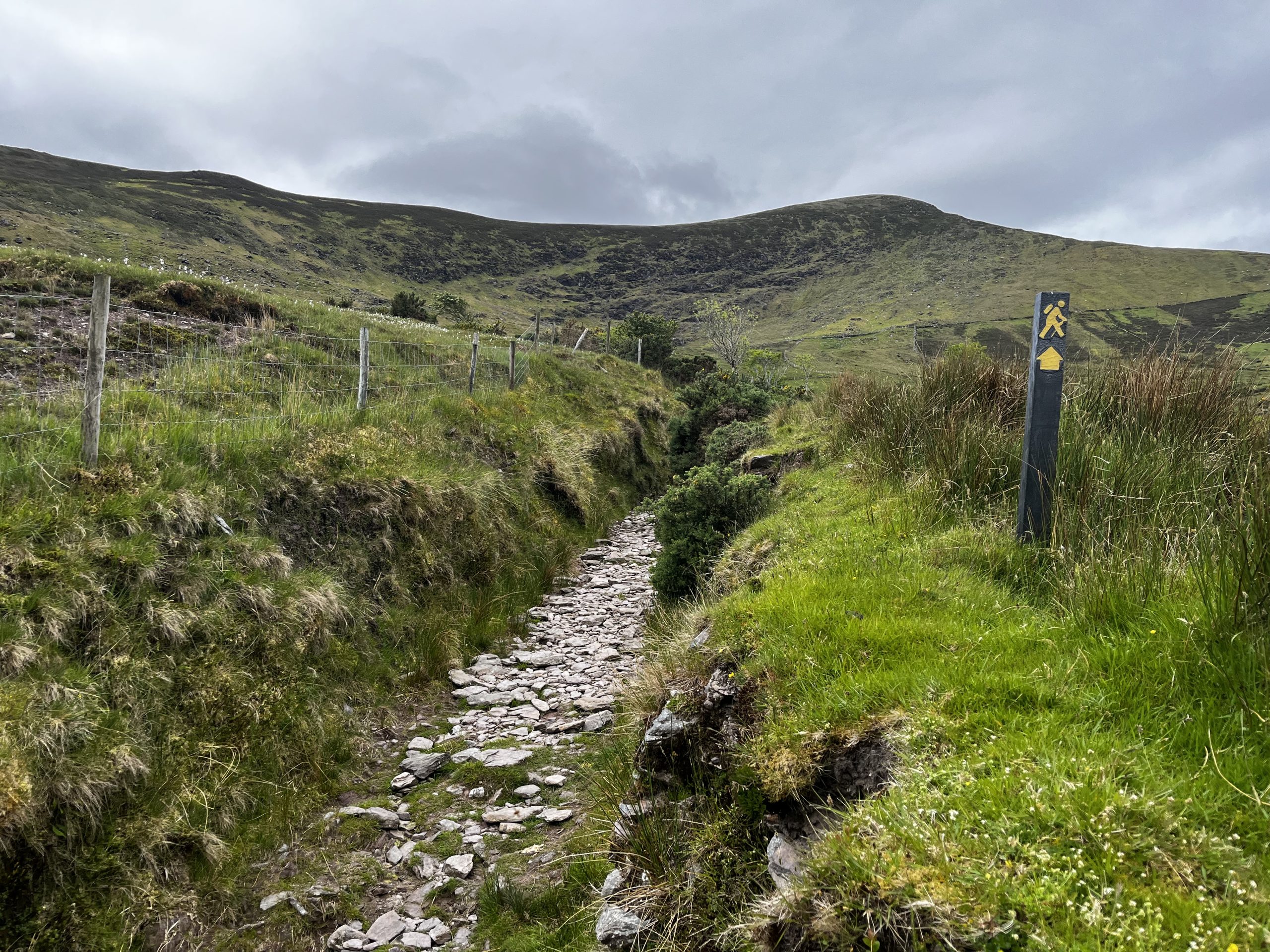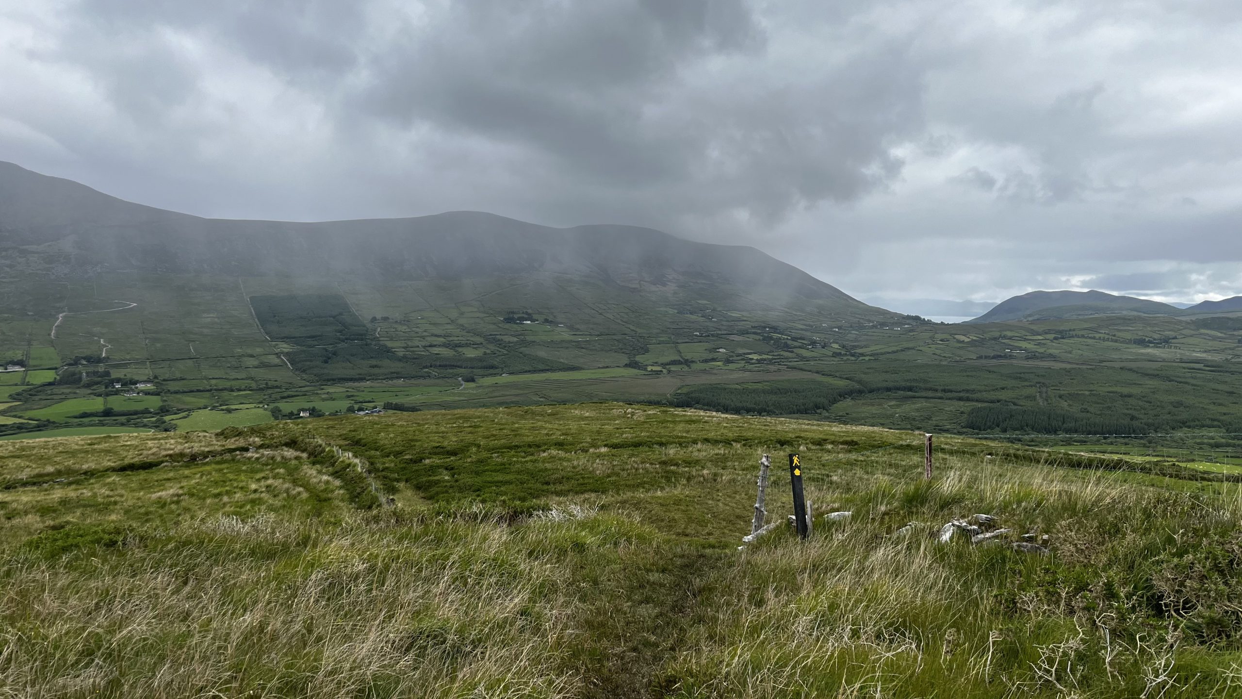 Der zweite Tag auf dem Kerry Way belohnt jene, die vorher ein bisschen trainiert haben. Und die Etappe ist echt gnadenlos zu denen, die sich auf einen leichten Spaziergang eingestellt haben. Wir haben sie unterwegs die Etappe der 1000 Hügel genannt. Die Strecke führt über einen langen Bergrücken mit stetigem Auf und Ab. Bei jedem Hügel denkt man, dass dies nun aber wirklich der höchste Punkt der Etappe sein muss, bevor sich das Land wieder für das Auge öffnet und man den nächsten Hügel vor sich sieht, vor dem man natürlich erst mal wieder ein Stück hinunter muss.