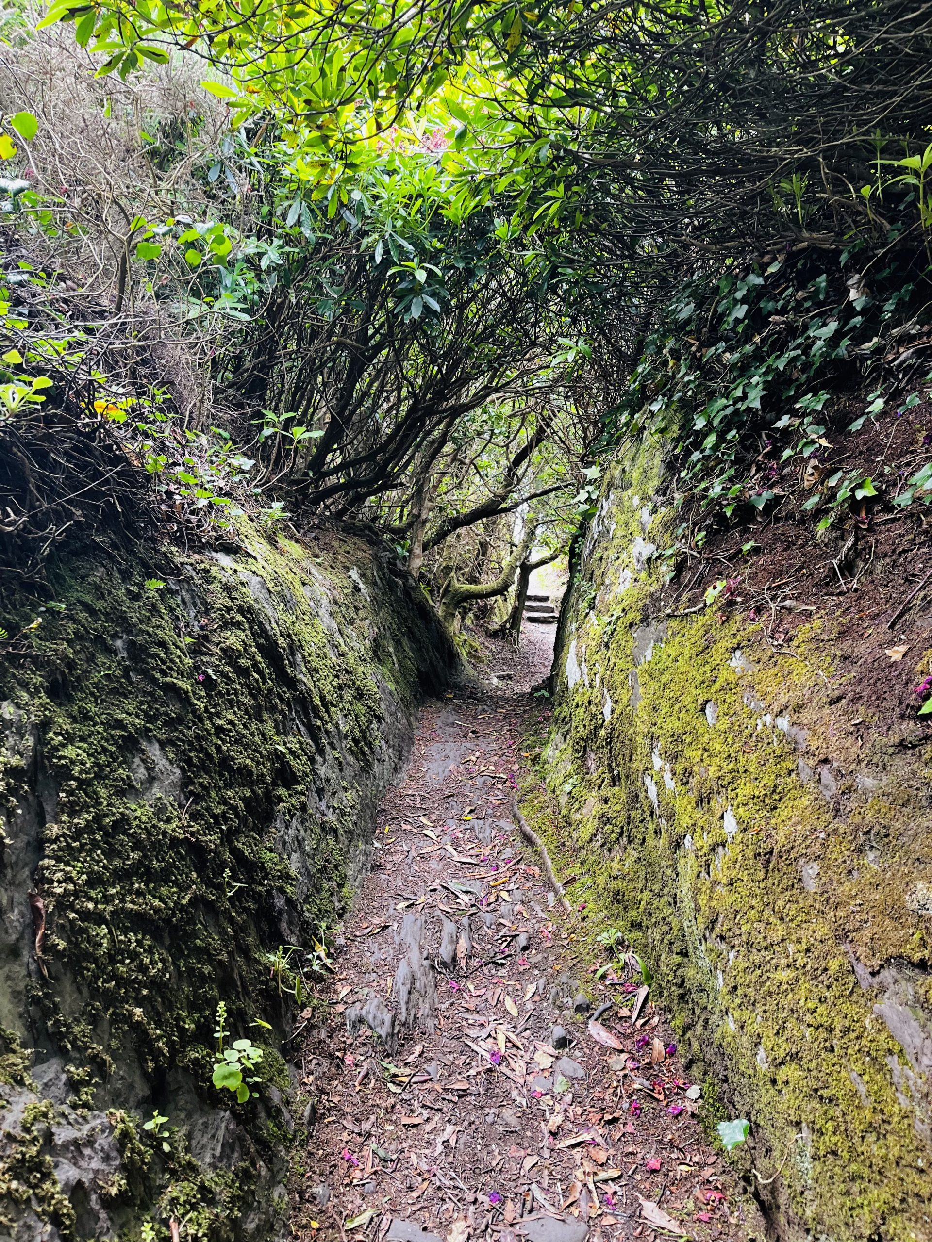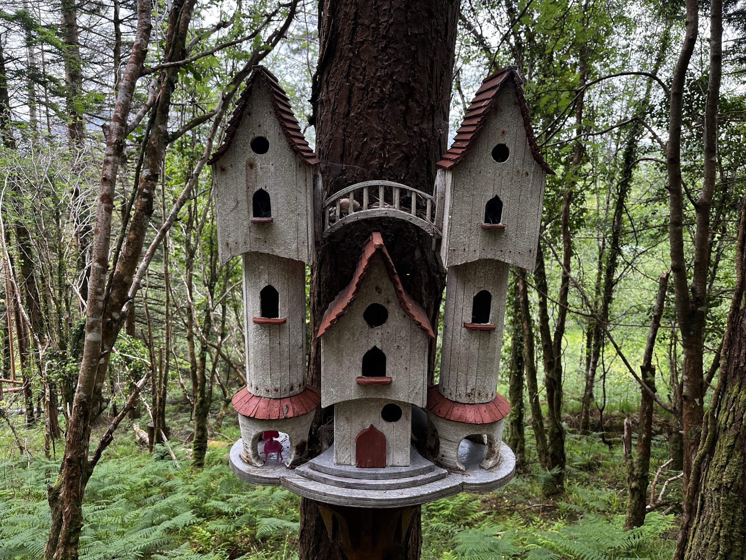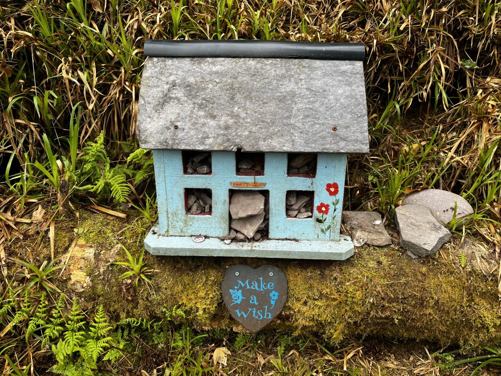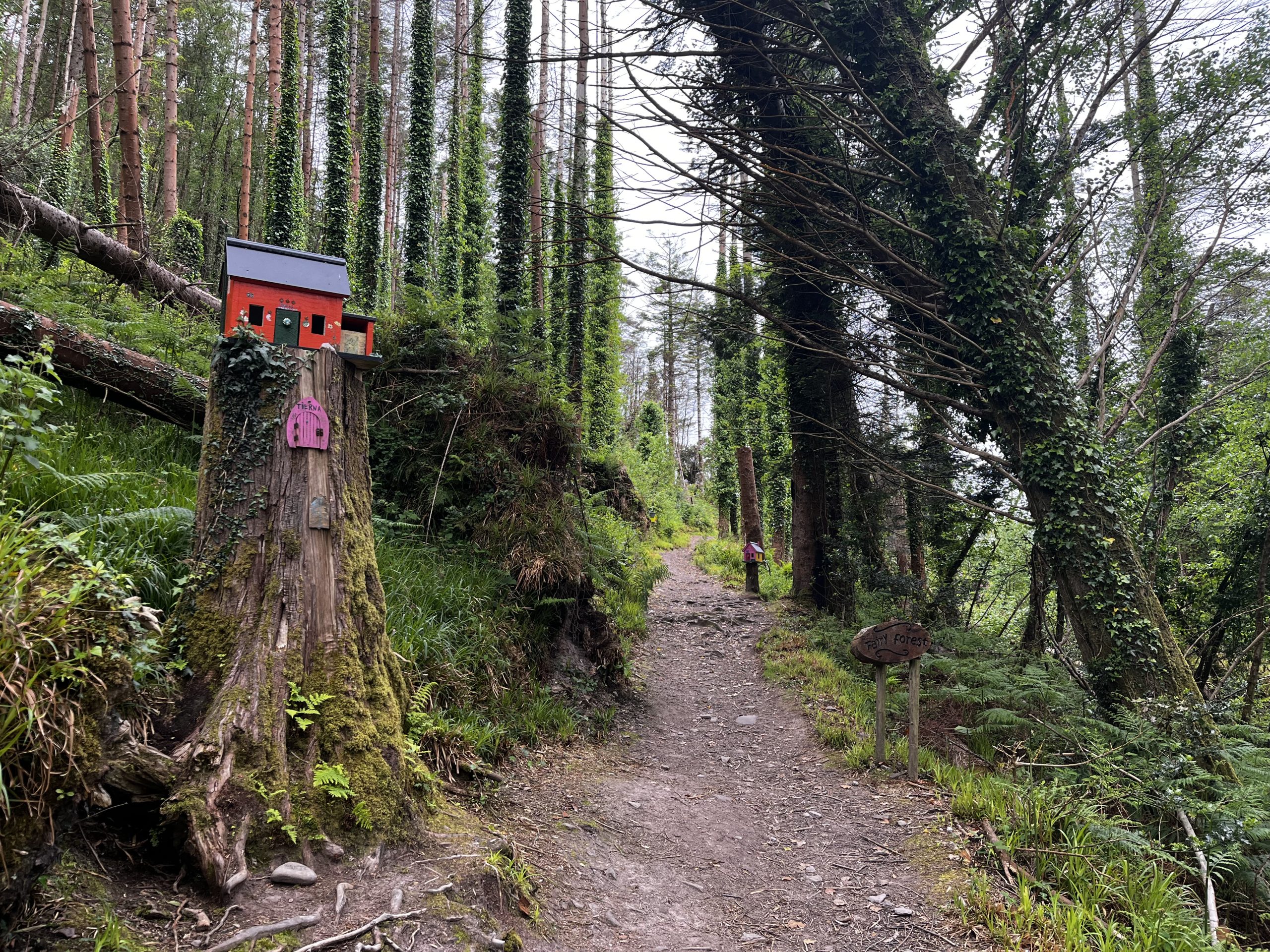 Der Kerry Way beginnt mystisch. Denn gleich hinter Glenbeigh läuft man bergan in einen dichten Wald hinein, dessen Weg von lauter liebevoll gestalteten kleinen Modell-Häuschen gesäumt ist. Diese sind so groß wie Puppenhäuschen und bieten den Fairies Unterschlupf. Das sind kleine Feenwesen, die der Sage nach in den Wäldern wohnen. Wenn man ganz leise ist, kann man sie hören, wie sie durch das Unterholz huschen.