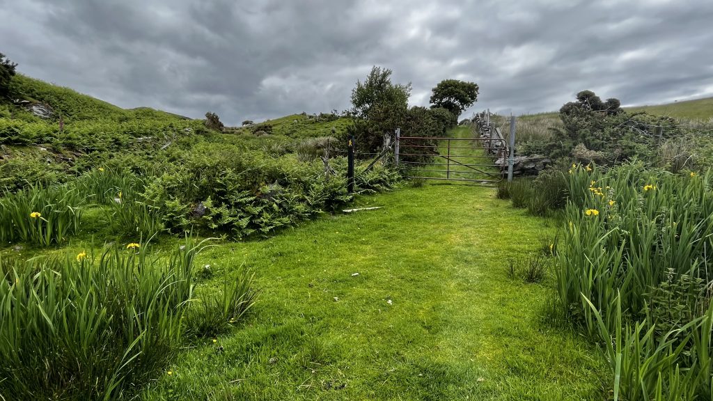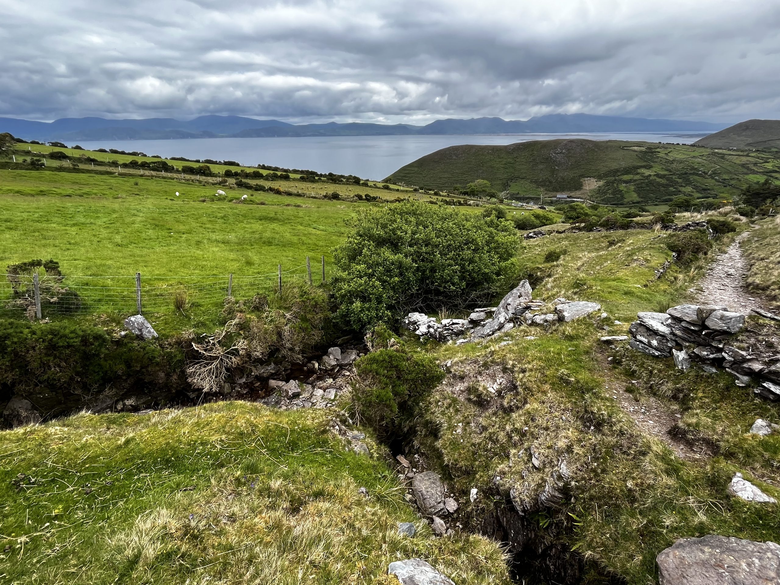 Von Caherdaniel geht’s wieder hoch in die Hügel. Oben bleibt man dann während der ganzen Etappe in etwa auf derselben Höhe, folgt den gelb-schwarzen Hinweisschildern und hat den Meeresarm immer zu seiner Rechten. Auf der gegenüberliegenden Seite liegt die Beara-Halbinsel auf der es, wie auch auf der Dingle-Halbinsel, auch einen Rundwanderweg gibt. Der Weg führt über Wiesen und Weiden und bietet einige schöne Eindrücke. Dass nicht ganz so spektakuläre Blicke dabei sind wie an den vergangenen Tagen, fand ich eher erholsam. Denn sonst ist man von Eindrücken auch schnell überfrachtet.