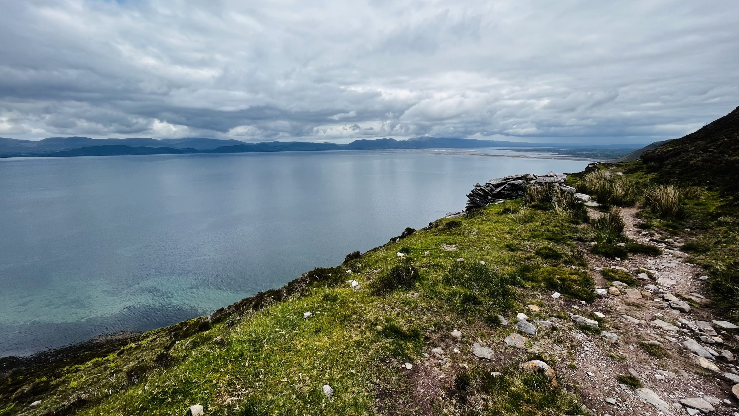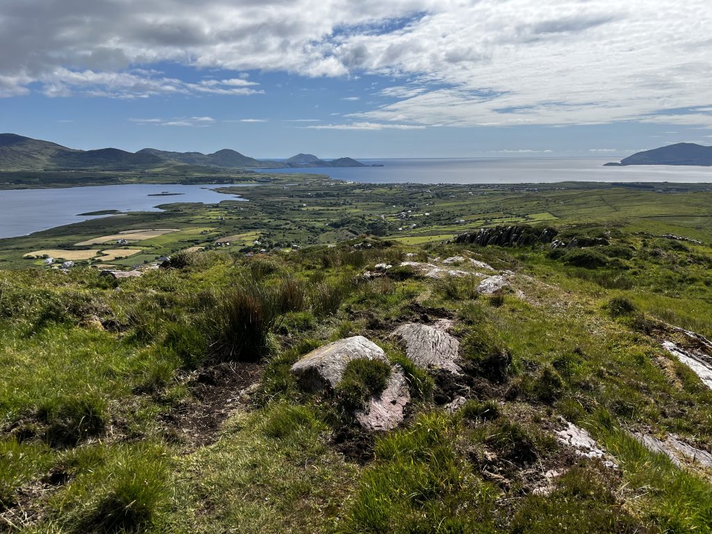 Nach dem Fairy Forest zieht sich die Landschaft erstmal über ein langes Stück gemächlich hin und erreicht dann die Rossbeigh Hills. Von ihrer Nordflanke aus hat man einen herrlichen Blick über den Meeresarm und auf die gegenüberliegende Dingle-Halbinsel. Ich hatte Glück mit dem Wetter und eine entsprechend weite Sicht. Da muss man beim Gehen schon aufpassen, wohin man tritt, denn den Blick kann man kaum von der Umgebung lösen. Dieses Panorama zieht sich über mehrere Kilometer an einem Hang entlang.