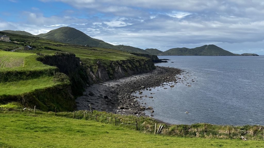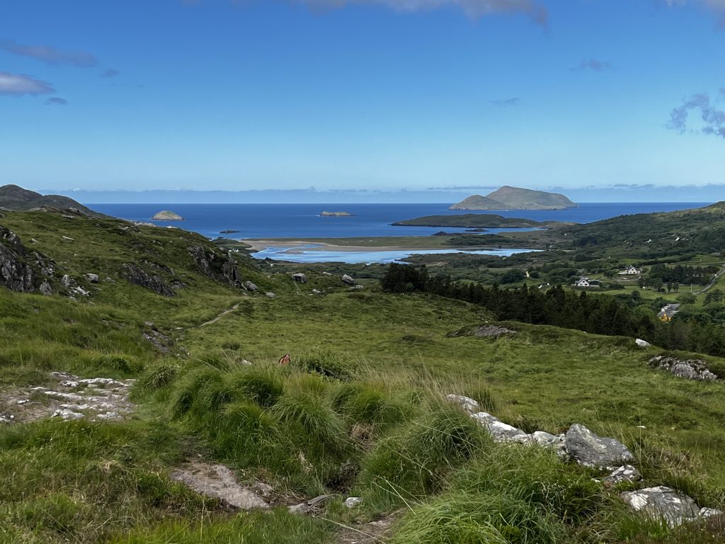 Hat man den kleinen Pass hinter sich gelassen, blickt man gleich auf eine wunderschöne Bucht mit kleinen vorgelagerten Inseln – die natürlich alle grün sind. Hier bietet sich unbedingt eine Pause an. Da die Etappe nur drei bis vier Stunden dauert, hat man massig Zeit, um die Landschaft zu genießen. So lohnt sich auch ein Abstecher, der vom Kerry Way runter Richtung Küste führt. Hier nimmt man den Abzweig Richtung Derrynane House. An der Küste gibt es ein paar tolle Sandstrände, die über einen sehr schönen Wanderweg verbunden sind.