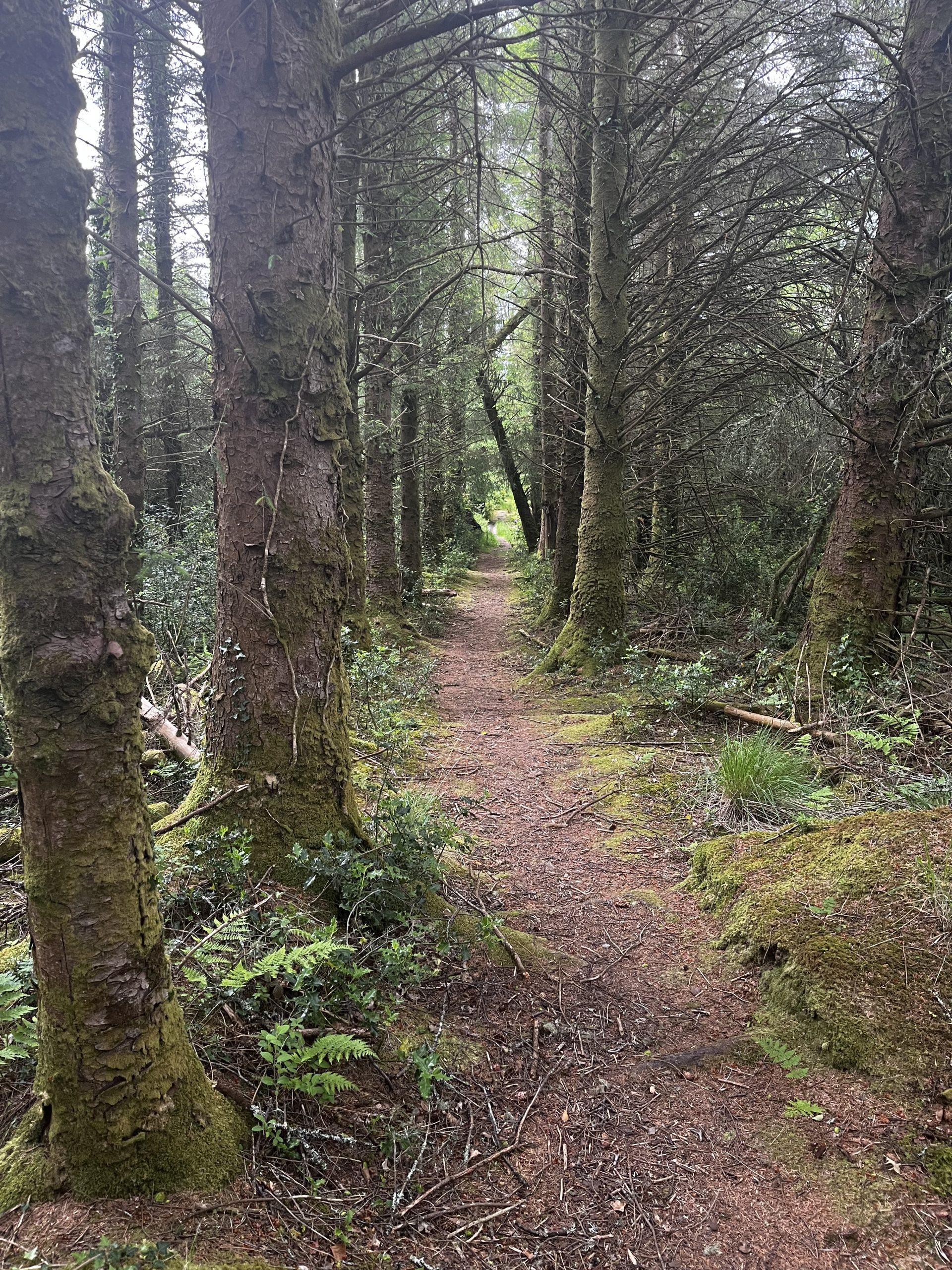Diese lange Etappe kann man auch wieder abkürzen, indem man mit der Unterkunft einen Transport zur Blackwater-Bridge verabredet. Bis dahin verpasst man nicht allzu viel und steigt gleich an einem der schönsten Teilstücke ein. Denn der Weg führt hier auf Meereshöhe durch bewaldetes Gebiet. Schön, erholsam und wieder ein ganz anderer Eindruck als an den vergangenen Tagen.