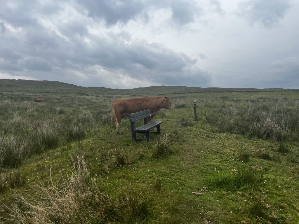 Der Weg hier ist sehr ausgetreten, und aufgrund des torfigen Bodens auch an vielen Stellen matschig. Den zu laufen, wenn es regnet oder mehrere Tage geregnet hat, ist sicher keine gute Idee. Aber auch wenn es längere Zeit nicht geregnet hat, tritt man immer wieder in matschige, rutschige Stellen die eine gewisse Trittsicherheit erfordern. Die fantastischen Ausblick ins Hinterland und Richtung Atlantik entschädigen aber für jeden mühsamen Schritt.