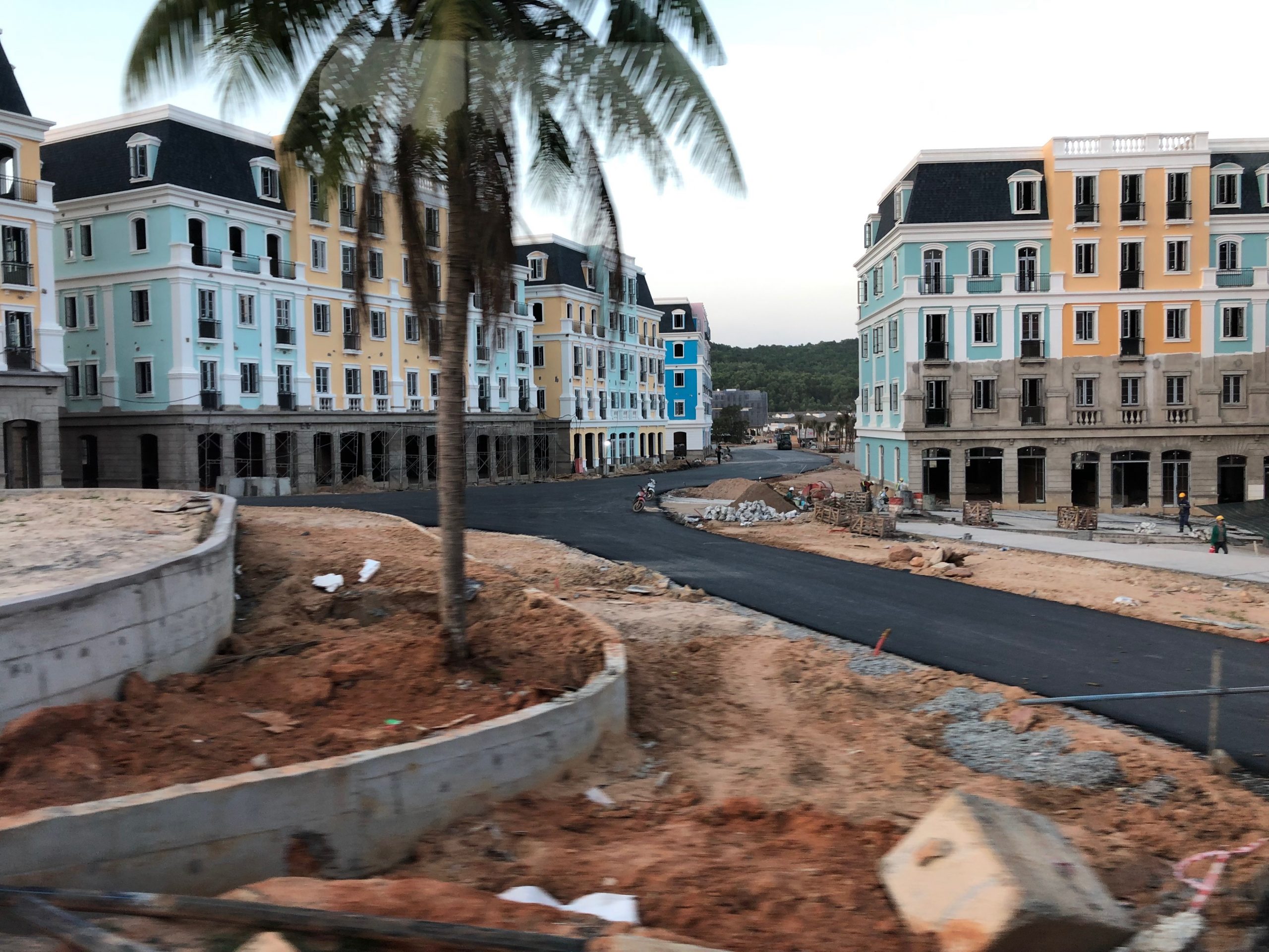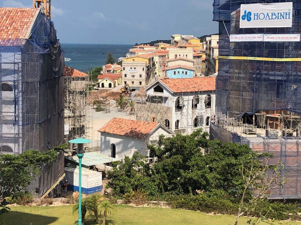 Phu Quoc wird derzeit in Rekordzeit zu einem Ferienziel ausgebaut, dass es in ein paar Jahren in Sachen Bettenzahl locker mit südostasiatischen Platzhirschen wie Phuket oder Bali aufnehmen können wird. Im Süden der Insel entstehen derzeit ganze Dörfer aus mehrstöckigen Gebäuden samt Prachtboulevards und Einkaufszentren. Eines dieser Mammut-Ressorts ist in der Optik italienischen Küstenorten nachempfunden. Die vierstöckigen Gebäude sollen wohl an Venedig, Florenz oder Amalfi erinnern und stehen dicht an dicht an einem Hang. Die Häuser sind dem Augenschein nach weitgehend fertig, Gäste sind aber noch keine drin. Das wird aber nicht mehr lange dauern.