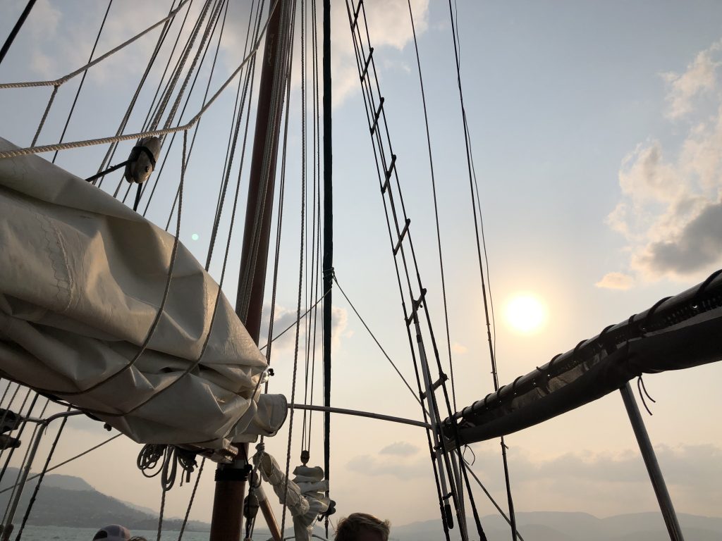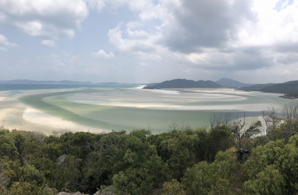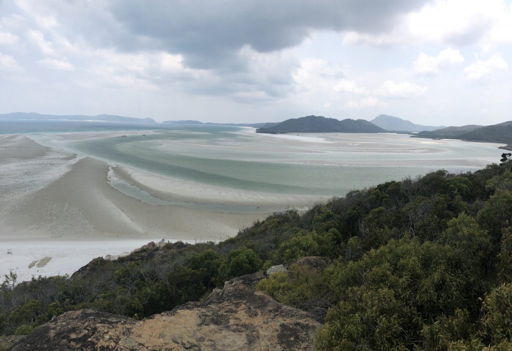 Mein Ziel in Richtung Norden war Airlie Beach, von wo die Touren auf die vorgelagerten Inseln starten, allen voran Whitsunday Island. Der Whitehaven Beach und vor allem die an dessen Nordende gelegene Wasserlandschaft auf schneeweißem Strand, taucht in so ziemlich jeder Doku über die Naturwunder Australiens auf. Ich habe eine eintägige Segeltour raus zu den Inseln gebucht. Man kann da auch Touren über mehrere Tage buchen, aber die Vorstellung, mit 24 Leuten dicht an dicht auf einer schaukelnden Nuckelpinne zu schlafen, fand ich nicht so faszinierend. Und im Rückblick hat der eine Tag auch gereicht, auch wenn man dann nicht so wahnsinnig viel Zeit hat, sich alles anzusehen. Am Whitehaven Beach kann man es problemlos auch länger als zwei, drei Stunden aushalten. Leider gab es ein paar dicke Wolken, als wir auf Whitsunday waren, aber spektakulär war es trotzdem. Das Wasser ist kristallklar, der Sand gehört nachweislich zu den weißesten der Welt – was will man da mehr?