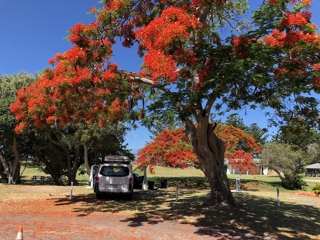 Rockhampton ist eine eher schäbige Industriestadt, da habe ich aber nochmal einen Termin bei einem Physiotherapeuten, der meinem doch sehr lädierten Rücken etwas Linderung zu verschaffen weiß. Ich kombiniere das Schöne mit dem Notwendigen und bleibe jetzt für zwei oder drei Nächte in Emu Park, einem kleinen Örtchen an der Küste, das einen wirklich schönen, entspannten, ruhigen und malerischen Eindruck macht. Die Auswahl meines Stellplatz auf dem Campingplatz macht richtig was her, auch wenn mir die Nachbarn schon erzählt haben, dass einem deutschen Paar, das hier vorher stand, heute früh aus dem roten Baum (weiß jemand, was das für einer ist?) eine kleine Schlange auf den Frühstückstisch gefallen ist. Ich hoffe einfach mal, dass die Frau das Vieh in Flucht gekreischt hat.