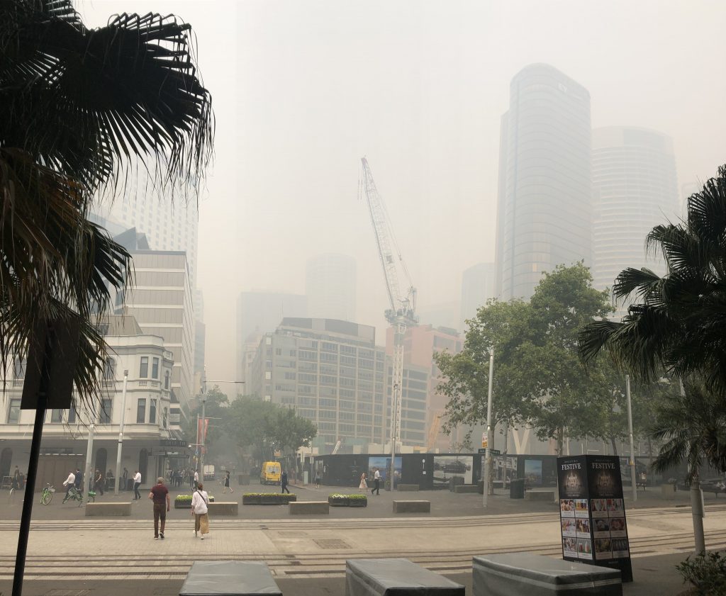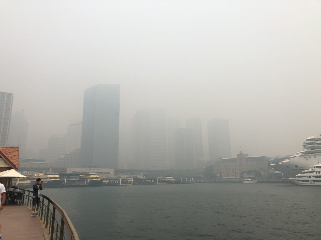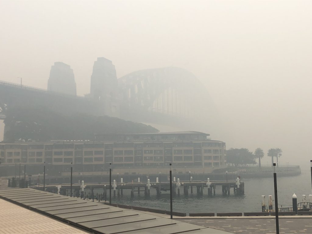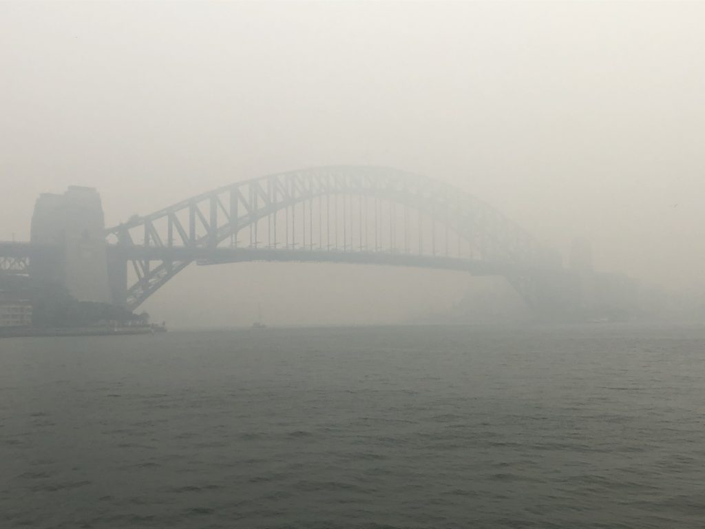 Sydney lag am Dienstag unter einer dichten Rauchwolke, die die Sicht innerhalb der Stadt teilweise auf unter 200 Meter begrenzte. Deutlich wahrnehmbarer Brandgeruch lag in der Luft, die Behörden warnten vor Gesundheitsgefahren für Menschen mit Atemwegsbeschwerden. Der Rauch drang von den vielen Buschfeuern im Umland von Sydney in die Stadt hinein. Die Brände speziell im Norden der Stadt sind weiterhin nicht unter Kontrolle, die Feuerwehr bemüht sich stattdessen, ein Übergreifen der Brände auf bewohntes Gebiet zu verhindern. In der Millionenmetropole war die Atmosphäre gespenstisch. Vom Circular Quay aus, dem Dreh- und Angelpunkt von Sydneys Verkehrswegen zu Lande und zu Wasser, wo sich täglich Tausende Touristen tummeln, konnte man die weltberühmte Harbour Bridge nur schemenhaft erkennen.